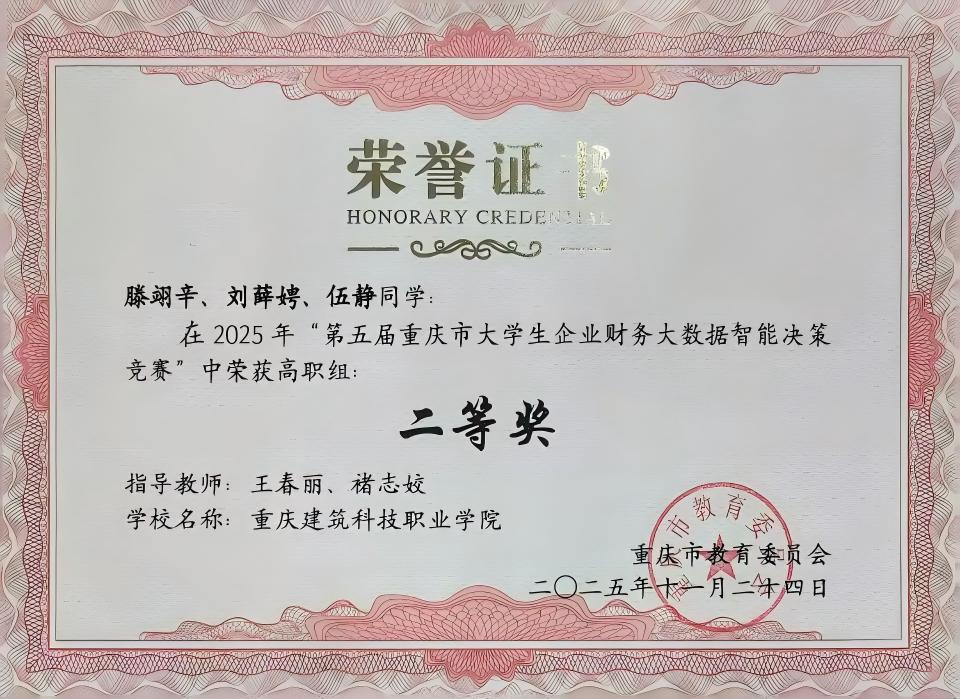 2025年10月底,由重庆市教育委员会主办、重庆师范大学承办的第五届重庆市大学生企业财务大数据智能决策竞赛圆满结束。本次竞赛共有55支本科队伍和48支专科队伍参赛,我校智慧商贸学院大数据与财务管理专业学生刘薛聘、滕翊辛、伍静组成的参赛队,在激烈的竞争中脱颖而出,荣获竞赛高职组二等奖!