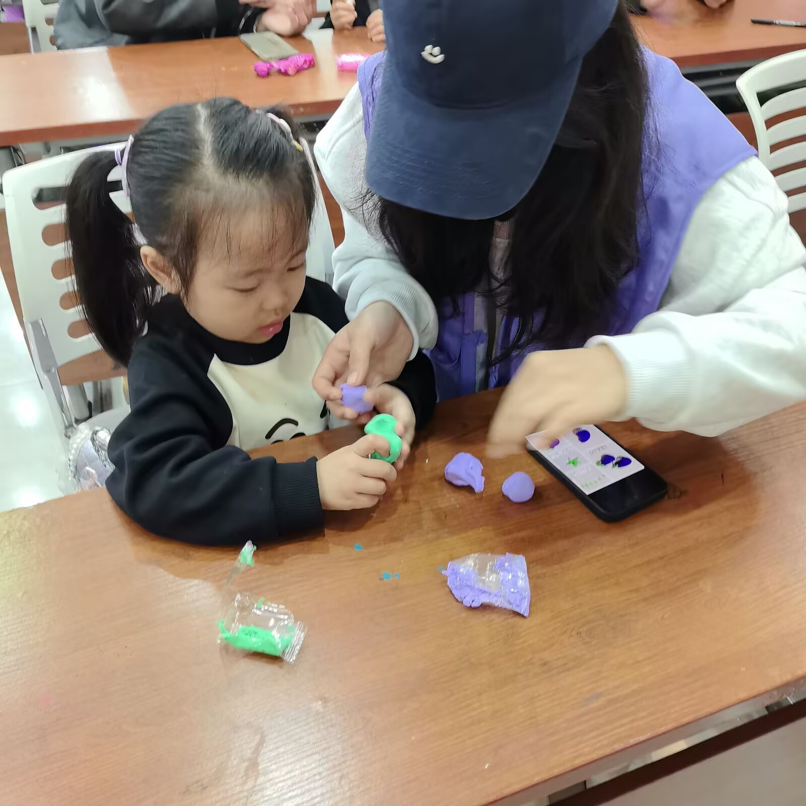 温馨的时间总是短暂的。捏粘土活动接近尾声,小朋友们展示了自己的作品,志愿者为他们颁发了奖励小红花和小礼物并拍照留念,记录下这一美好的瞬间。