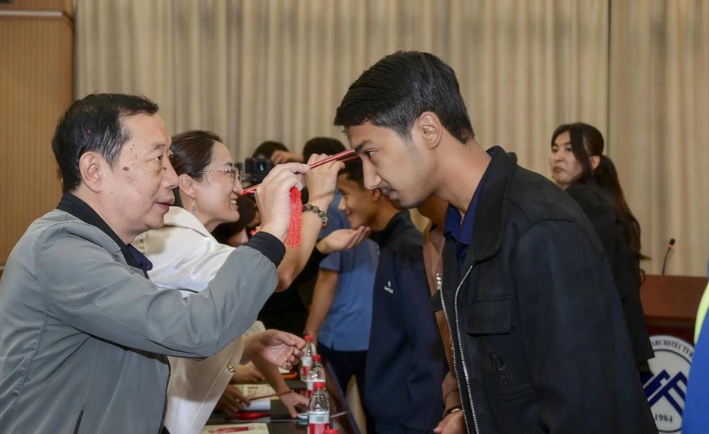 随后进行的“朱砂启智”传统仪式将活动推向高潮。校领导与教师代表为留学生轻点朱砂,寓意启智明心、慧光长存,寄托对学子们勤学不辍、前程似锦的殷切期许。