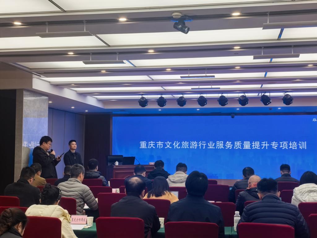 2025年12月1日,学校智慧康养学院技能大师张涛教授为重庆市文化旅游委、各区县文化旅游委分管负责人,科室负责人以及市文旅行业协会和相关企业负责人开展了一场主题为“邂逅、对话、共情”的文旅行业服务质量提升专题培训。