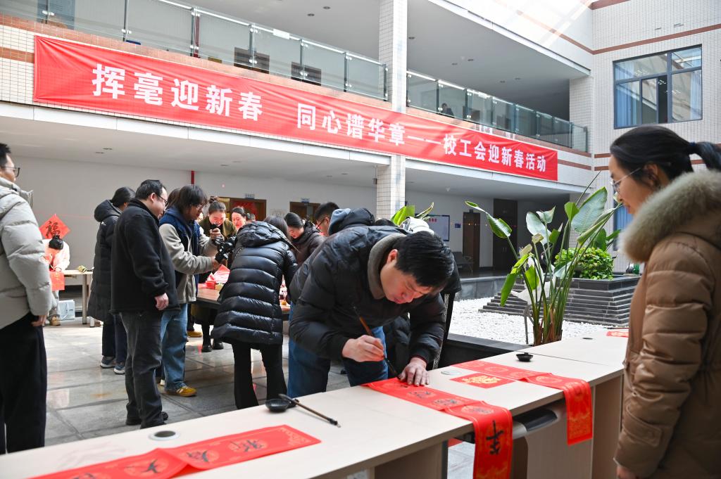 活动现场,年味十足。学校党委书记何光明与教职工们挥毫泼墨,以笔会友,以墨传情。大家将美好的祝愿凝聚笔端,一对对或苍劲有力或流畅秀美的春联跃然纸上,既有传统吉祥语,也有富含创意与时代感的词句,如“立德树人育英才 砥砺奋进谱新篇”,既展现了教职工们的书法才艺,体现了学校教职工对传统文化的传承与创新,也寄托了大家对新一年的美好期盼。