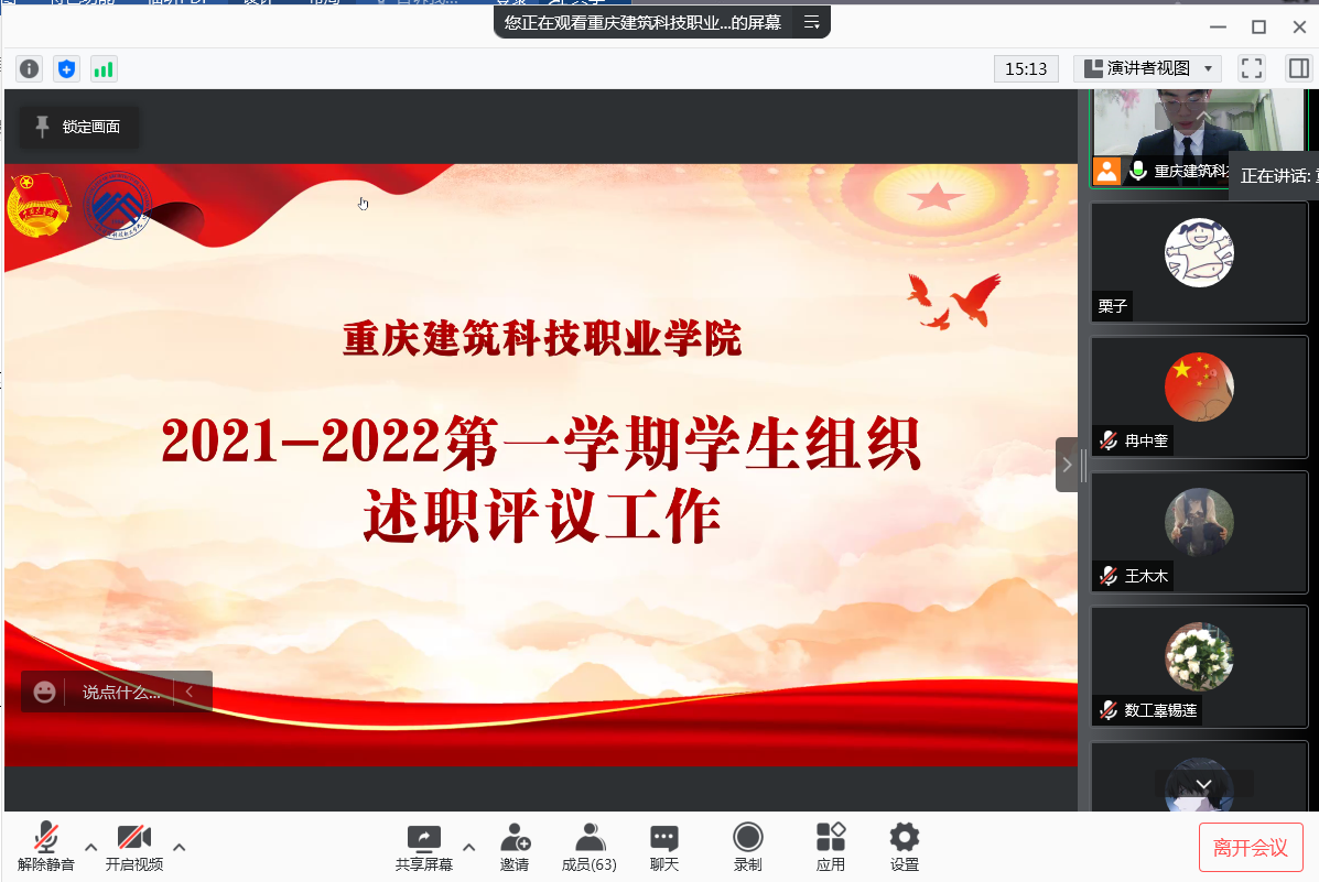 为进一步总结我校学生会在2021下半年的工作情况,增强学生会自我教育、自我管理和自我服务意识不断提升,校学生会于2022年1月7日星期五15:00在线上举行本学期总结述职评议。本次会议由团委书记霍紫沁主持,学生会主要负责人分别述职,各二级学院学生代表50余人参与评议。