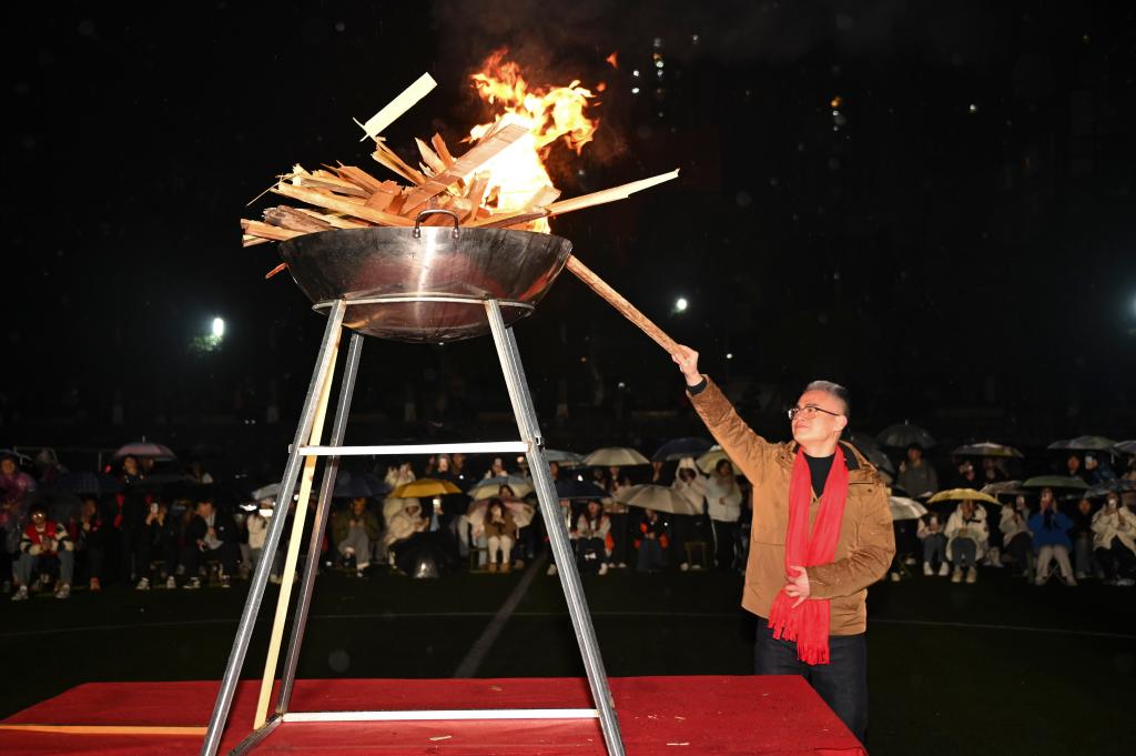 颁奖结束后,晚会进入核心环节——篝火点燃仪式。李朝国副书记手持火炬,稳步走向场地中央的柴堆,在全场师生的共同见证下点燃篝火。橘红色的火焰熊熊燃起,映照着每一张年轻而坚毅的脸庞,雨滴穿过火光化作点点光斑,场面庄重而热烈。篝火燃起后,《焰舞共新岁》随机舞蹈环节正式开启,现场打破专业与业余的界限,全体师生自发参与其中,围绕篝火围成数个同心圆,每个人都成为舞台的主角。火焰噼啪声、欢快的音乐声与师生们的欢笑声交织在一起,奏响岁末最温暖的交响。