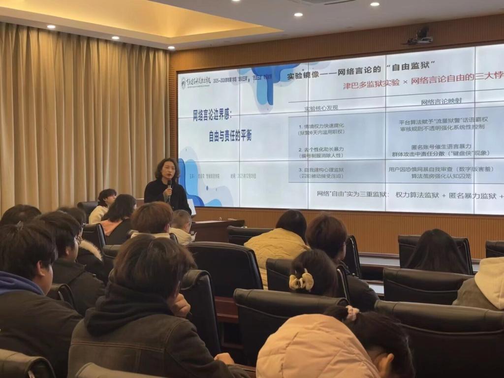 分享会的高潮环节聚焦于网络言论“越界”的深层原因与法律红线。黄老师先通过津巴多实验等心理学案例,拆解了“去个性化”、“群体极化”、“即时满足”等导致网络言行失范的心理机制,让学生理解自身网络行为背后的心理逻辑;随后,主持人从民事、行政、刑事三个层面,结合朋友圈泄露隐私、校园群发布虚假恐慌信息等真实案例,清晰划定了网络言论的法律边界,强调严重网络暴力、煽动闹事等行为将承担沉重的法律后果,“法律红线如电网,触碰即有严重后果”的观点让在场学生深受触动。