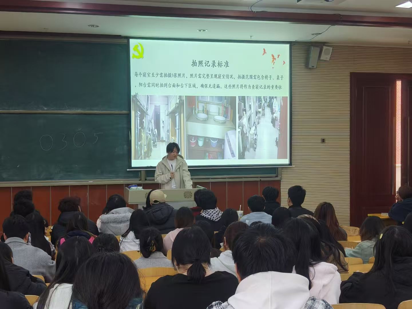会议伊始,宿管会会长蔡松呈对日常查寝工作进行了详细说明。查寝将严格遵循“定时定点、细致全面”原则,于每晚八点五十分至九点三十分开展,会议上强调了查寝人员需着装规范,重点排查宿舍卫生、违规电器、宠物饲养及门口杂物堆积等安全隐患。同时,会议明确了拍照记录标准,要求每个寝室至少拍摄 3 张全景照片,杜绝模糊、不全等问题,确保查寝记录真实可追溯。