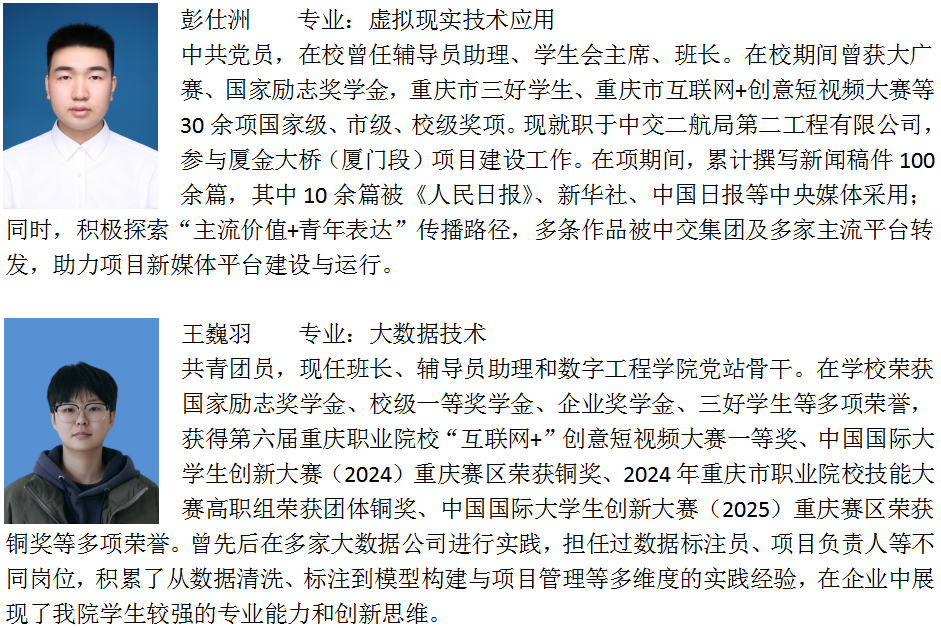 数字工程学院紧扣重庆 “33618” 现代制造业集群与 “数字重庆” 建设需求,以 “服务工业互联网、培育数字工匠” 为核心定位,构建 “产教融合、赛教互促、专创融合” 的人才培养体系。学院以大数据技术专业群为核心,联动物联网应用技术、云计算技术应用、计算机网络技术、人工智能数据工程技术专业,形成 “底层共享、中层分立、高层互选” 的模块化课程体系,精准对接工业数据 “采集 - 传输 - 分析 - 应用” 全产业链;以 “新双高” 建设为引领,联合深圳市讯方技术股份有限公司、重庆翰海睿智大数据科技股份有限公司等企业,纵深赋能现有合作专业、开拓信息技术领域新合作,筑牢专业集群生态企业圈,共建 “产学研训创” 一体化协同育人平台,聚焦数字技术应用创新人才培养,探索实施 “链群对接、岗课融通、分层分类、产学并行、数智融合” 育人模式,通过 “双导师”(企业工程师与校内教师共定方案、共授课程)、“双证书”(1+X 证书高通过率)持续优化培养针对性与适应性。学院以赛促学成效显著,毕业生就业率连续五年超 96%(2024 年达 97%),用人单位满意度 75%,优质就业率 40%,为重庆智能网联新能源汽车、新一代电子信息等产业输送大批技术人才,校企合作、产教融合、数字赋能课程建设等典型案例,获中国教育发展战略学会、重庆市教育委员会等权威认可。