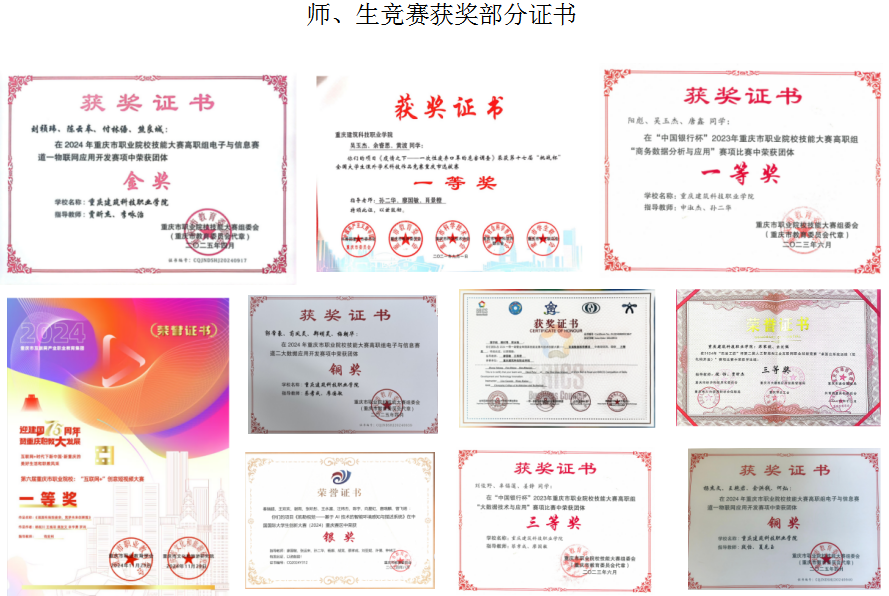 数字工程学院办学成效显著,近年来,学院生源数量不断增加,质量不断提升,毕业生与在校生数量相对稳定,现有全日制在校生1600余人。主编出版教材30余部,发表高水平论文80余篇,完成国家级、省部级科研课题40余项。学生获国家级、省部级奖项60余项,其中全国职业院校技能大赛高职组商务数据分析比赛三等奖、“挑战杯”全国大学生课外学术科技作品重庆 赛区一等奖、中国区华为ICT大赛重庆实践赛云赛道一等奖、重庆市职业院校技能大赛商务数据分析赛项一等奖、重庆市职业院校技能大赛物联网应用开发赛项一等奖、重庆市职业院校技能大赛大数据技术与应用赛项二等奖、中国国际大学生创新大赛银奖、重庆市职业院校技能大赛网络系统管理赛项、云计算赛项、物联网应用开发各三等奖。
