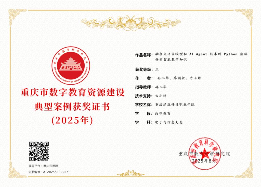 重庆市数字教育资源建设典型案例获奖证书(2025年)