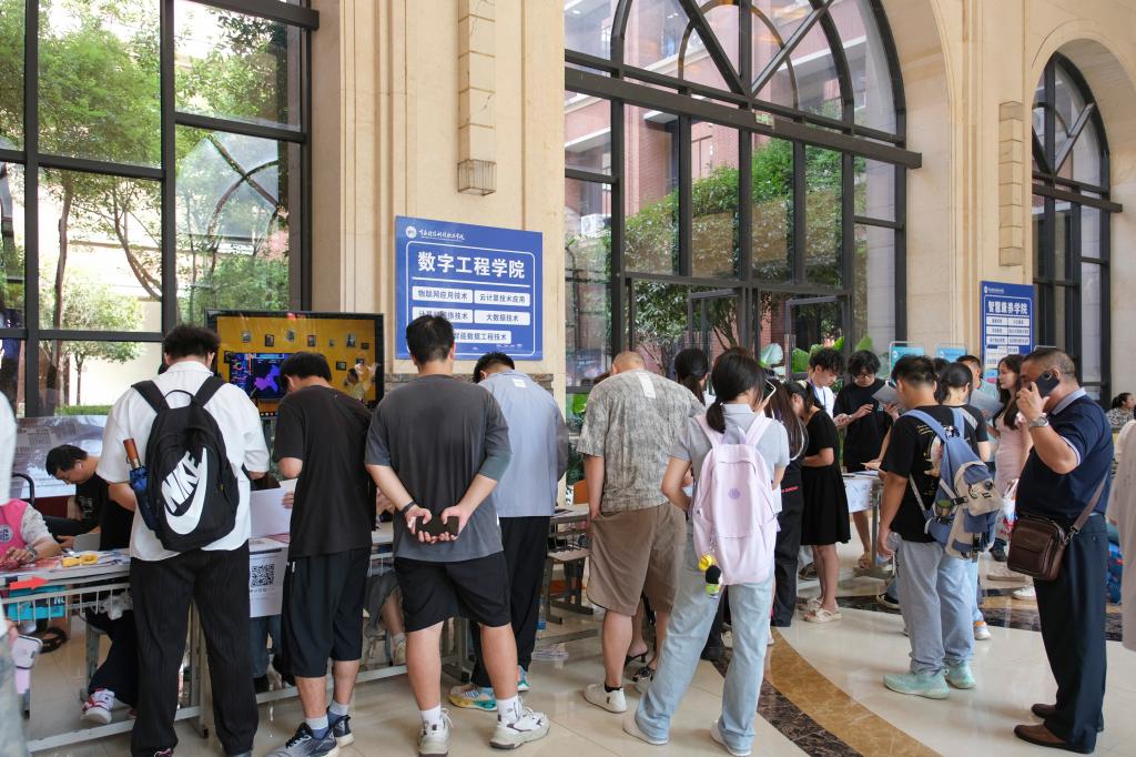 志愿者们早早便分散在校园各处“蹲守”。在学校大门口,他们看到拖着行李箱的新生,便立刻迎上去,一边接过行李,一边热情地打招呼:“同学,欢迎来到数字工程学院!”随后,便陪着新生向报到点走去。走到教学楼下,他们会介绍说:“这几栋楼里有很多专业教室,以后上课经常会来。”