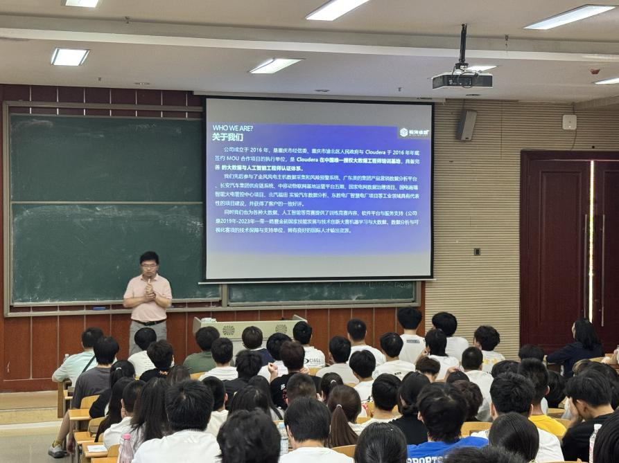 重庆翰海睿智大数据科技股份有限公司产教融合部副部长钟林江老师随后就企业背景、行业资源以及校企合作所能为学生提供的支持进行了详细介绍。他表示,翰海睿智将为大数据技术专业学生提供企业实训平台、真实项目实践机会、行业认证辅导及就业推荐等一系列资源,助力同学们在校期间便能接触行业实际、积累实战经验。